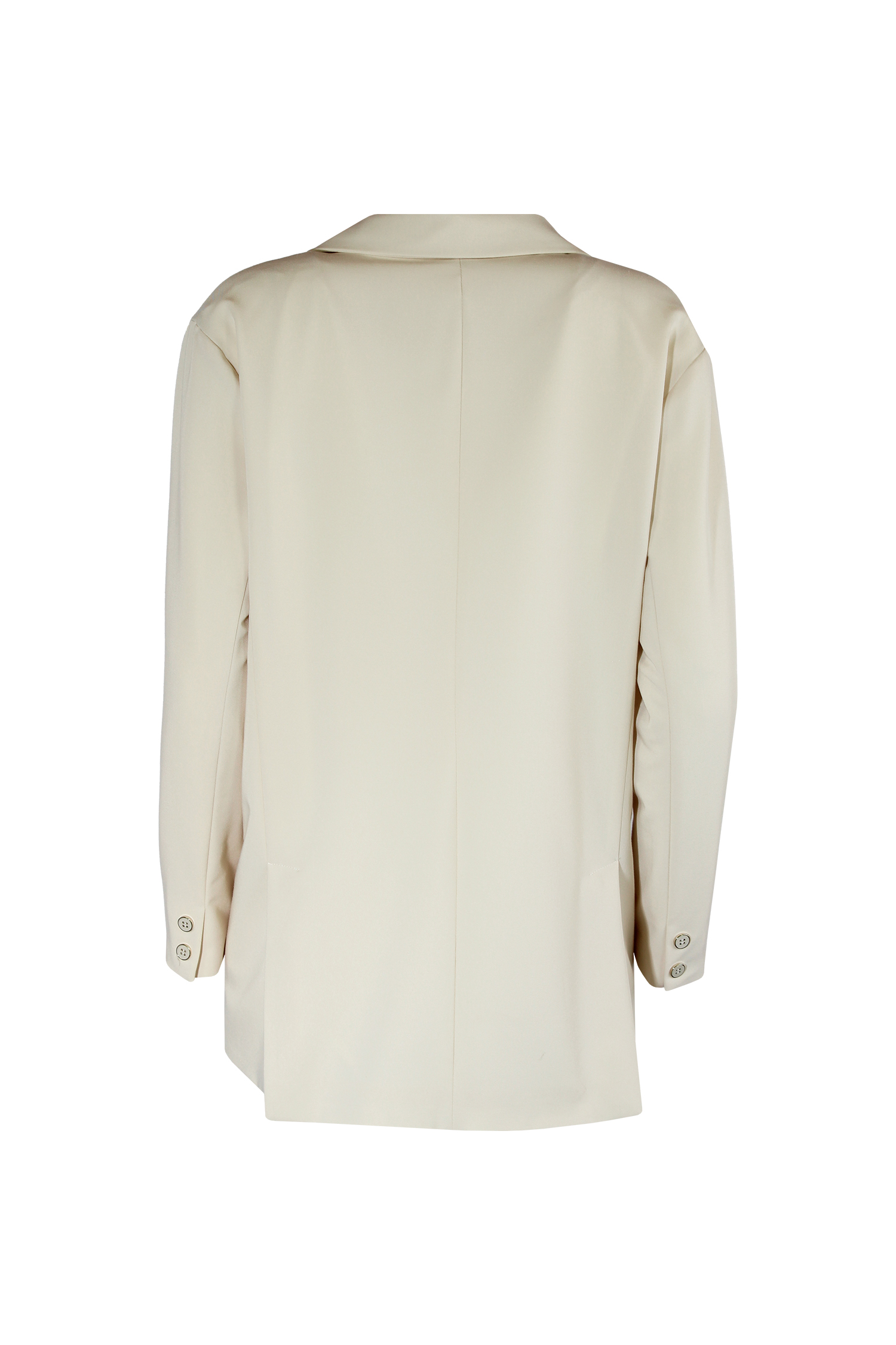 Blazer de corte direito com gola de lapela. Manga comprida com ombros levemente marcados. Bolsos de aba à frente. Fecho frontal mediante botões.