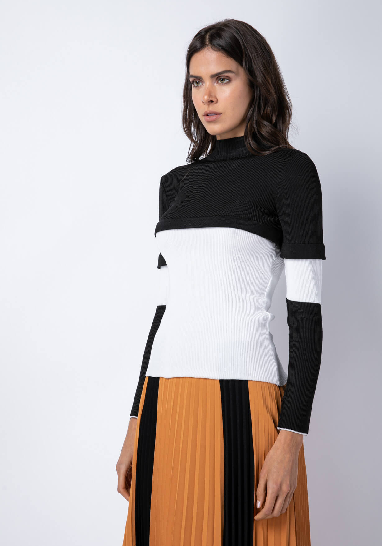 Oferecendo muita modernidade aos looks a blusa slim bicolor com recortes e gola alta é a soma perfeita de conforto e elegância. Para um passeio no final de semana componha com calça de alfaiataria, mocassim e bolsa tiracolo.