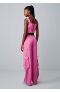 A calça tem cintura alta, bolsos cargos, detalhe em botões no cós, caimento alfaiataria e modelagem wide leg.