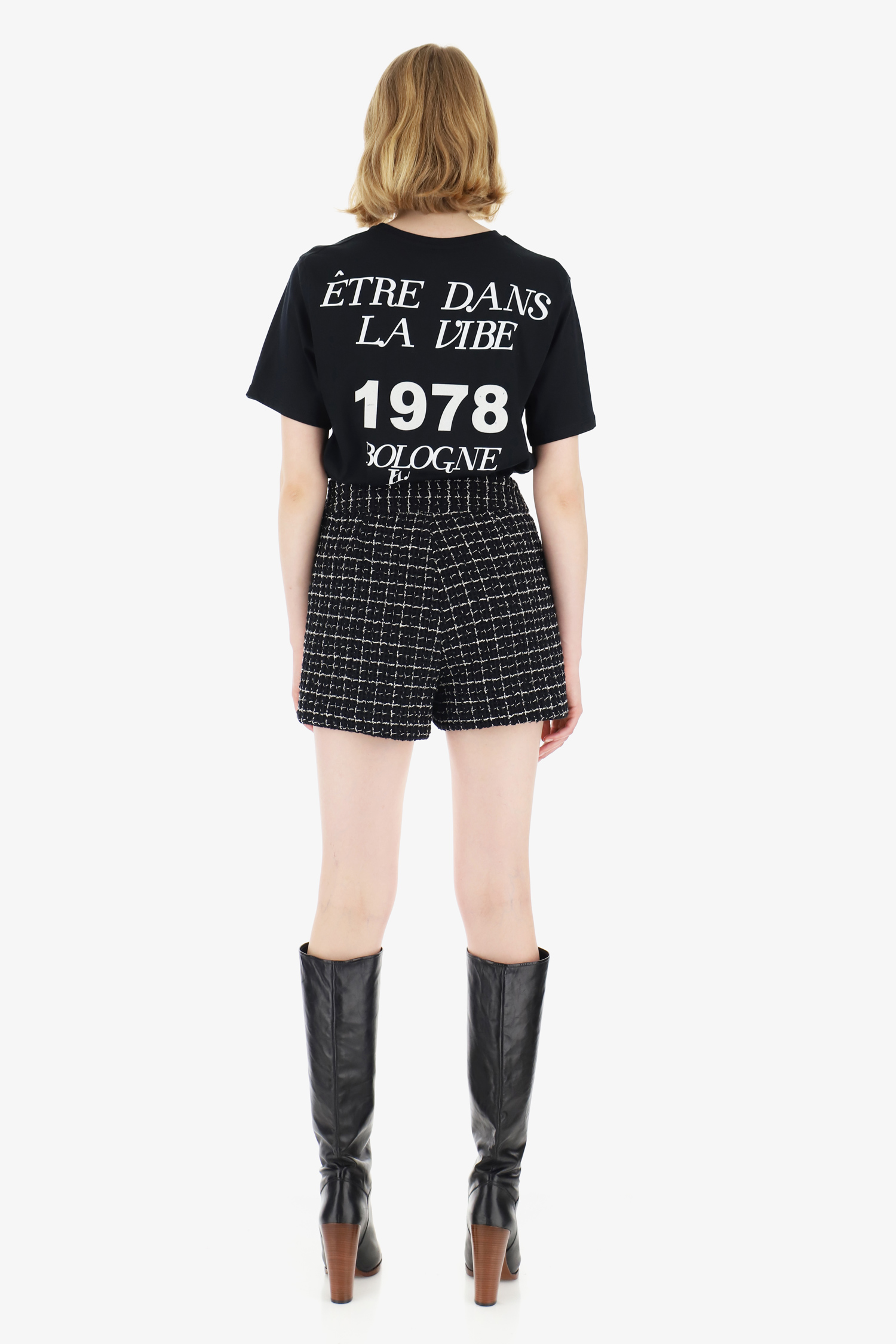 Calções retos de cintura média em tweed, com bolsos falsos com abas de contraste e botões de jóia.