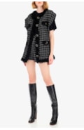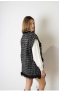 Colete em tweed bordado com bolsos com abas. Detalhe penas na gola, bainha e bolsos e botões jóia.