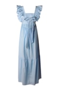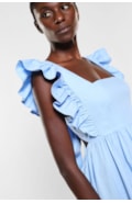 Vestido longo de decote quadrado e manga curta com folhos. Detalhe de tiras atrás ajustável com laçada. Cintura atrás com elástico.