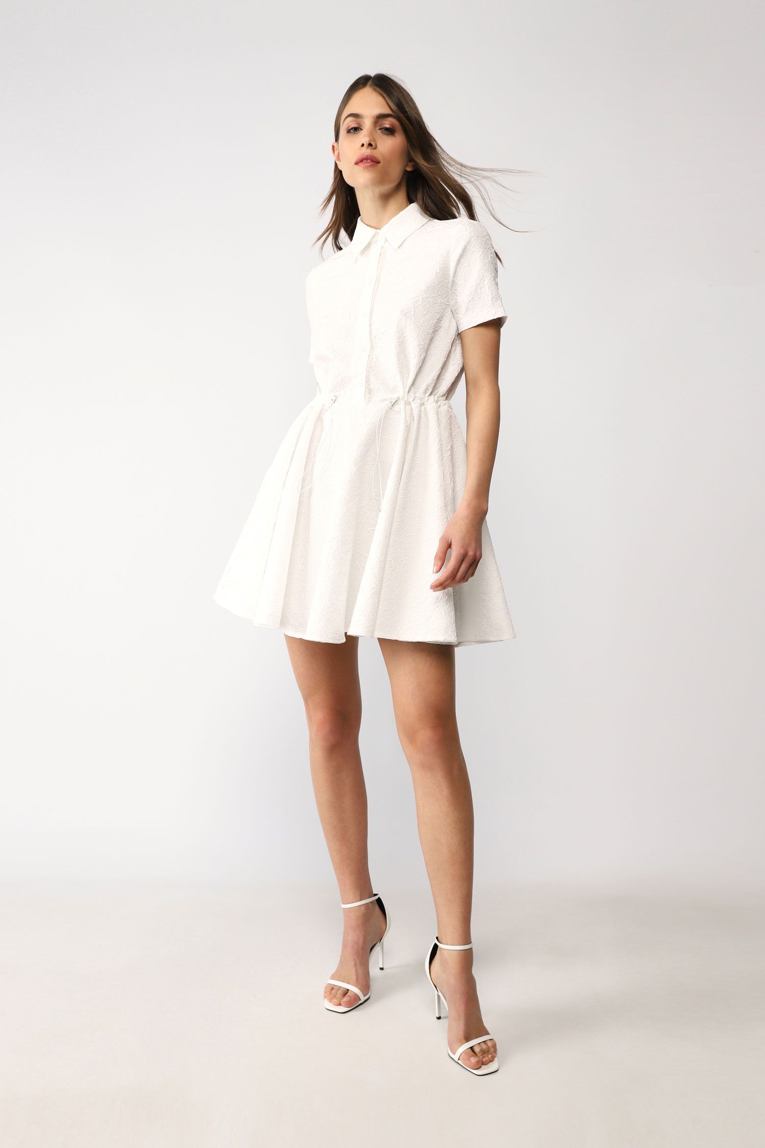 Vestido curto em tecido enrugado (efeito froissé), com gola clássica, fecho parcial de botões, mangas curtas, cintura elástica com cordão e saia rodada.