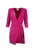 Vestido curto drapeado com fivelas metálicas. Decote em v e mangas 3/4.