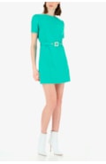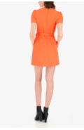 Vestido curto com manga curta e gola redonda. Detalhe franzido nos ombros. Acompanha cinto do mesmo tecido. Fecho de correr invisivel atrás.