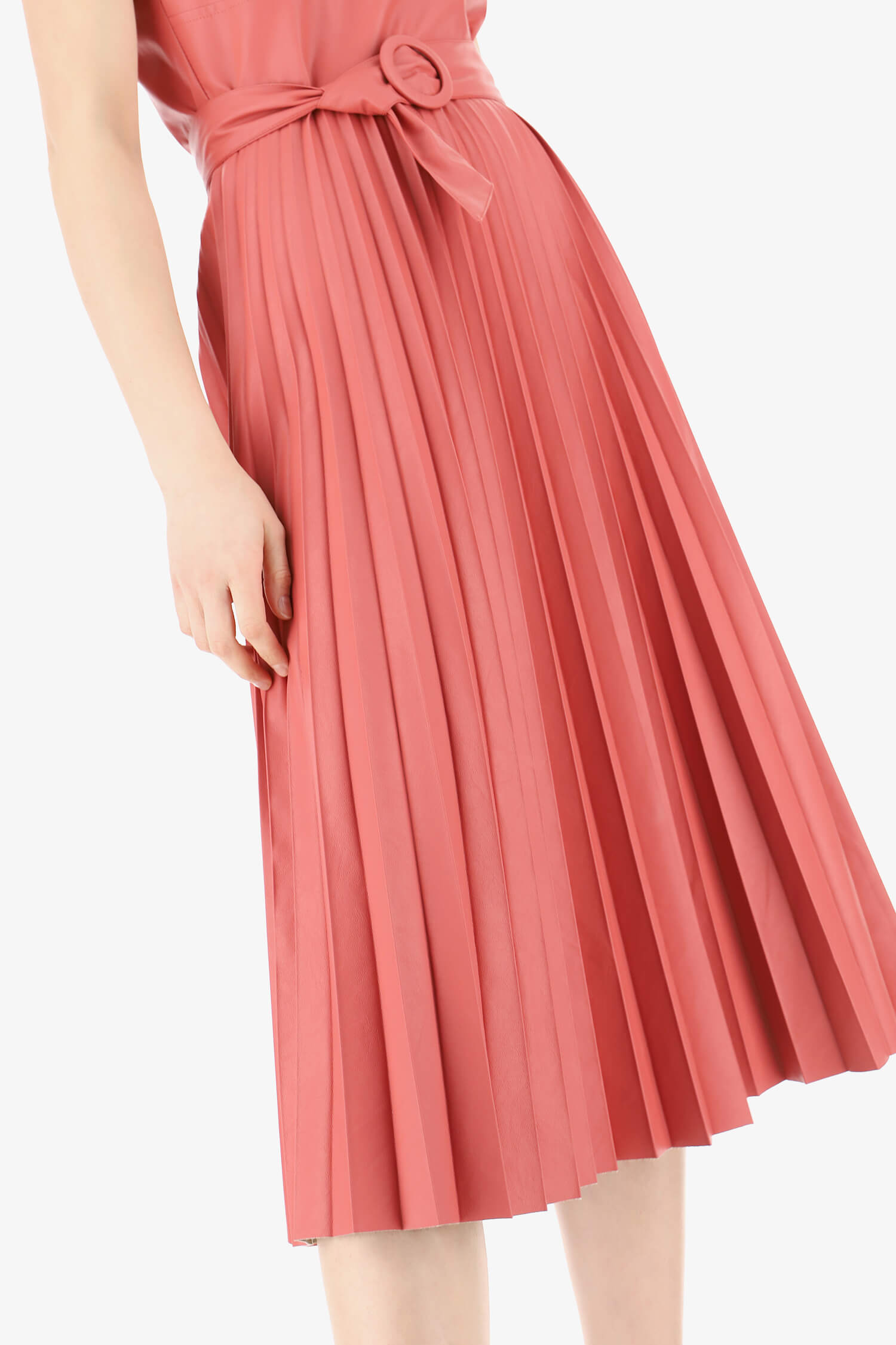 Vestido midi efeito pele, com decote em V e manga cava. Parte inferior plissada. Acompanha cinto no mesmo tecido. Fecho de correr lateral escondido.