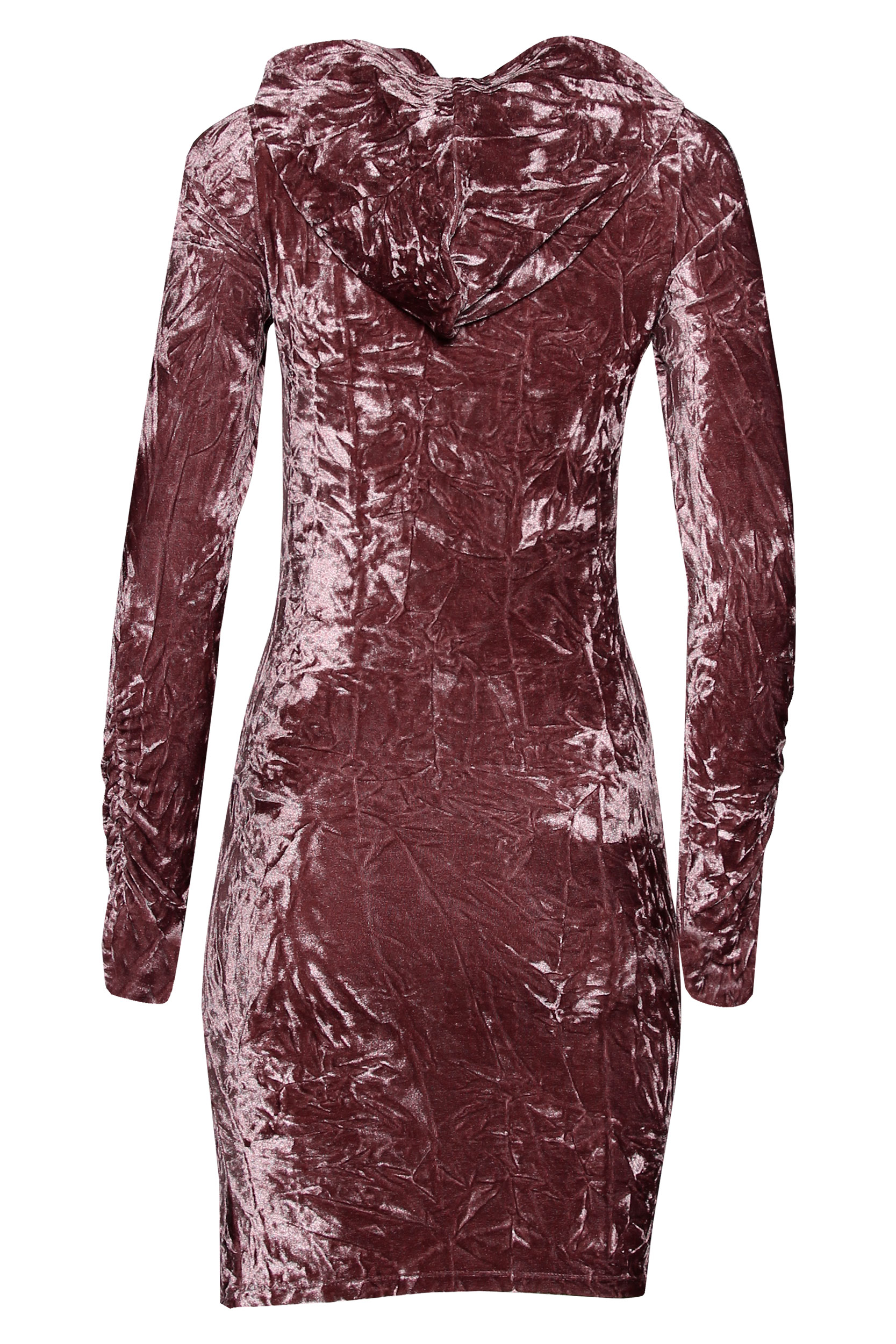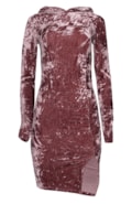 Vestido curto com capuz e manga comprida. Franzido na parte inferior da manga e na lateral frente com abertura no fundo.